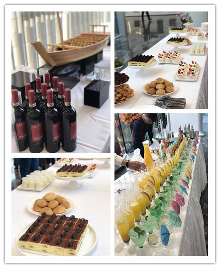 庆典仪式之后,在新总部一楼的中庭广场,热闹的员工庆祝酒会开始了。精美诱人的各式西点、五颜六色的鸡尾酒等特饮供应,悠扬的小提琴演奏乐、古筝乐表演醉人心弦,员工们在欢声笑话、美酒佳肴中分享着对新总部迁入的喜悦,珍惜着这个可以让大家欢乐交流与畅饮的好机会。